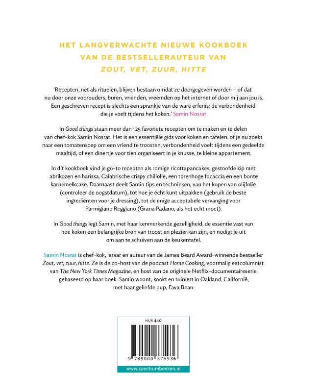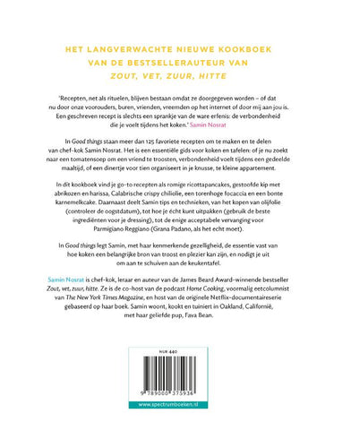 In Good things staan meer dan 125 favoriete recepten om te maken en te delen van chef-kok Samin Nosrat. Het is een essentiële gids voor koken en tafelen: of je nu zoekt naar een tomatensoep om een vriend te troosten, verbondenheid voelt tijdens een gedeelde maaltijd, of een dinertje voor tien organiseert in je knusse, te kleine appartement.