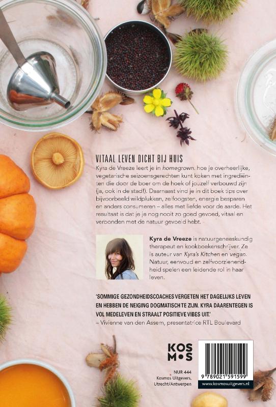 Kyra de Vreeze leert je in ‘homegrown.’ hoe je kookt met lokale en zelfgeteelde seizoensproducten. We vinden het vanzelfsprekend dat de supermarkten vol liggen met prachtig geteelde groenten, maar wat weten we zelf eigenlijk over het telen, verwerken en conserveren van eten? Pak de regie terug en ontdek hoe je met liefde voor de aarde voedsel kunt verbouwen en kunt koken (ja, ook in de stad!). Het resultaat is dat je je nog nooit zo goed gevoed en vitaal gevoeld hebt.