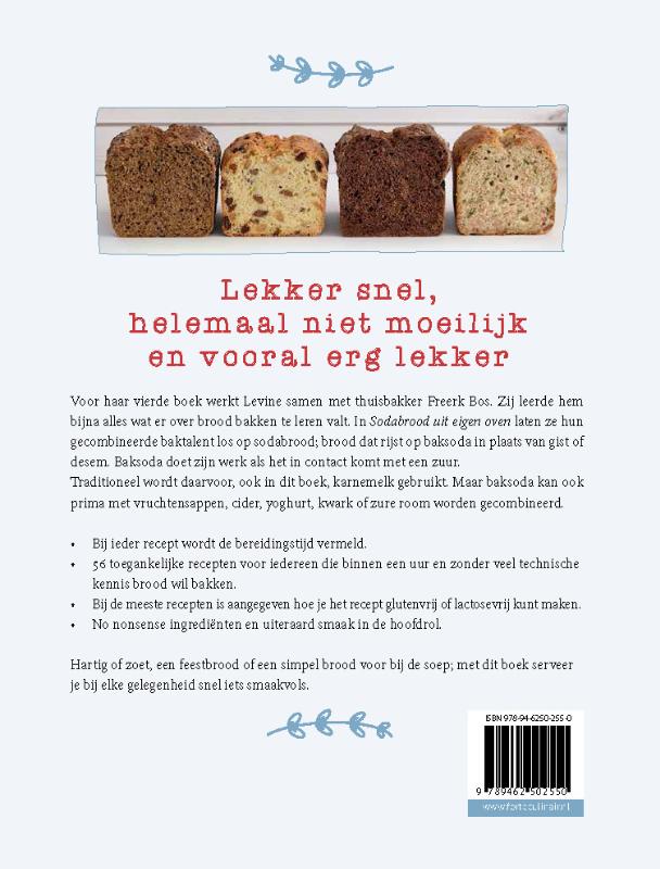 Voor haar vierde boek werkt Levine samen met thuisbakker Freerk Bos. Zij leerde hem bijna alles wat er over brood bakken te leren valt. In Sodabrood uit eigen oven laten ze hun gecombineerde baktalent los op sodabrood; brood dat rijst op baksoda in plaats van gist of desem. Baksoda doet zijn werk als het in contact komt met een zuur. Traditioneel wordt daarvoor - ook in dit boek - karnemelk gebruikt. Maar baksoda kan ook prima worden gecombineerd met vruchtensappen, cider, yoghurt, kwark of zure room.