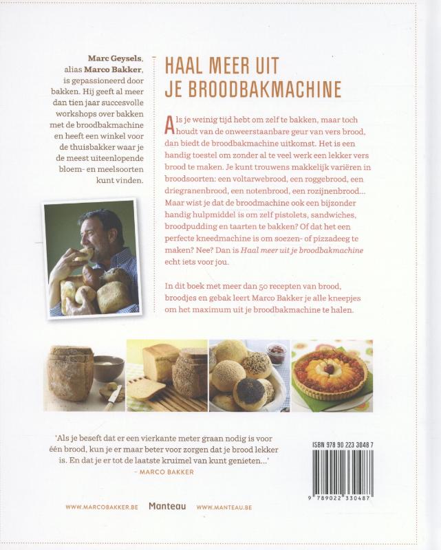 In dit boek met meer dan 50 recepten van brood, broodjes en gebak leert Marco Bakker je alle kneepjes om het maximum uit je broodbakmachine te halen. Marc Geysels, alias Marco Bakker, is gepassioneerd door bakken. Hij geeft al meer dan tien jaar succesvolle workshops over bakken met de broodbakmachine en heeft een winkel voor de thuisbakker waar je de meest uiteenlopende bloem- en meelsoorten kunt vinden.
