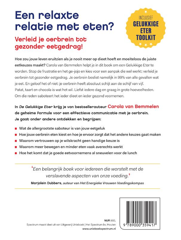 Hoe zou jouw leven eruitzien als je nooit meer op dieet hoeft en moeiteloos de juiste eetkeuzes maakt? Carola van Bemmelen helpt je in dit boek om een Gelukkige Eter te worden. Stop de frustratie en het ge-jojo en kies voor een aanpak die wel werkt: verleid je oerbrein tot gezonder eetgedrag. Je oerbrein beslist namelijk in 99% van alle gevallen wat je eet. En geloof het of niet: je oerbrein heeft absoluut schijt aan de schijf van vijf. Patat, taart en chocola is wat het wil. Liefst iedere dag en graag in grote hoeveelheden. Om die reden saboteert het ieder dieet en ieder gezond voornemen.