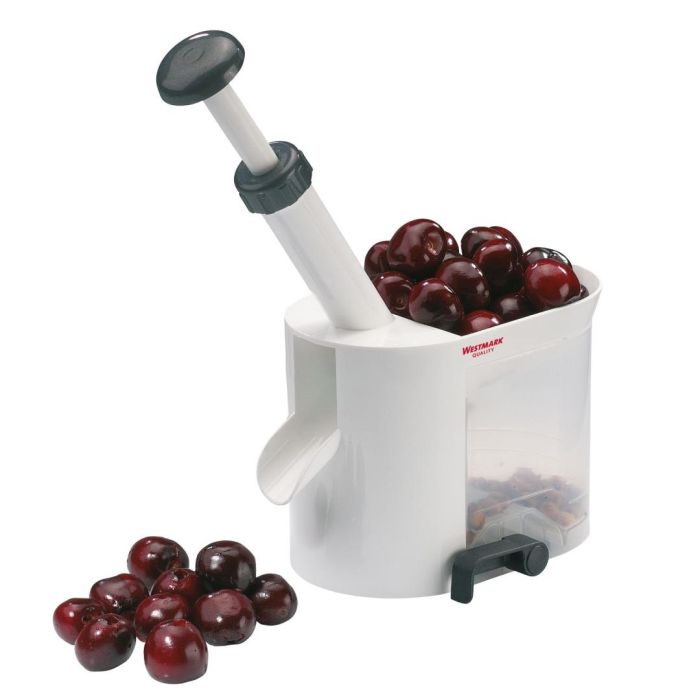 Met deze kersontpitter van Westmark ontpit je kersen snel en gemakkelijk. De ontpitter is geschikt voor zowel verse als ingemaakte kersen. Het werkt eenvoudig: je vult de ontpitter bovenin met kersen, deze rollen één voor één de onpit-holte in. Je ontpit de kers eenvoudig dankzij het stevige roestvrij stalen kruismes. De pitten vallen in de bak onderin, de ontpitte kers vang je op in een schaal of kom. De zuigvoet zorgt voor een stevige stand op het werkblad. De kersontpitter is gemaakt van kunststof. Na gebruik wordt aanbevolen de ontpitter met de hand in lauw water te wassen.