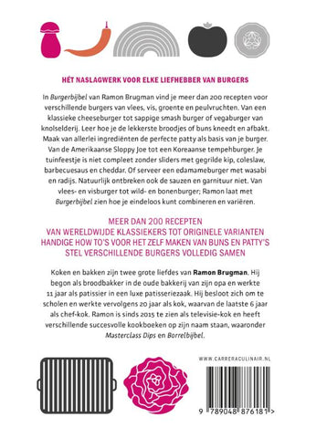 In Burgerbijbel van Ramon Brugman vind je meer dan 200 recepten voor verschillende burgers van vlees, vis, groente en peulvruchten. Van een klassieke cheeseburger tot sappige smashburger of vegaburger van zoete aardappel. Leer hoe je de lekkerste broodjes of buns kneedt en afbakt. Maak van allerlei ingrediënten de perfecte patty als basis van je burger.