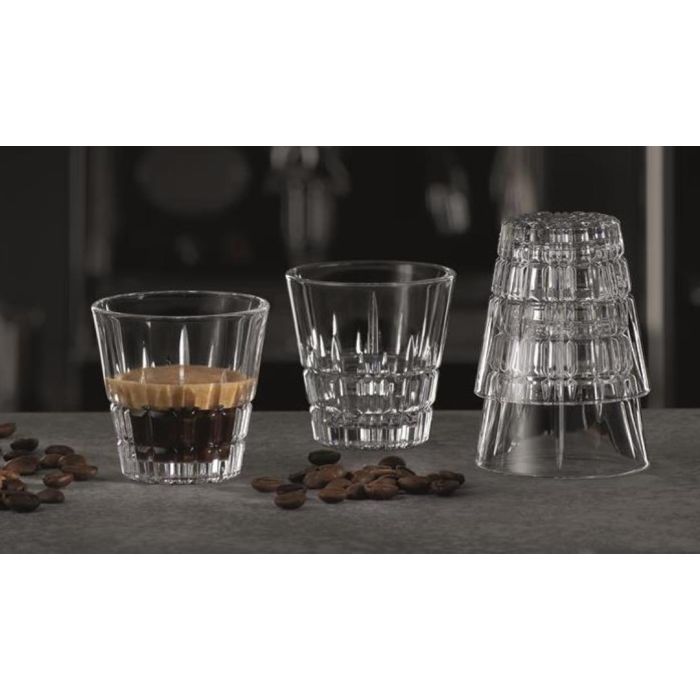Het espressoglas uit de serie 'Perfect Serve Collection' van Spiegelau is perfect voor een stijlvolle, sterke espresso. Het glas is vervaardigd uit duurzaam, helder, krasvast kristalglas dat blijft glanzen en is zo ontworpen dat de glazen onderling goed stapelbaar zijn. De dikte van het glas houdt de espresso lang warm . De 'Perfect Serve Collection' heeft een tijdloos en elegant patroon. De perfect geslepen figuren zorgen voor een prachtige weerspiegeling van het licht. Dit espressoglas kun je ook gebruiken als shotglaasje. De set bevat 4 espressoglazen, ieder met een inhoud van 80 milliliter.