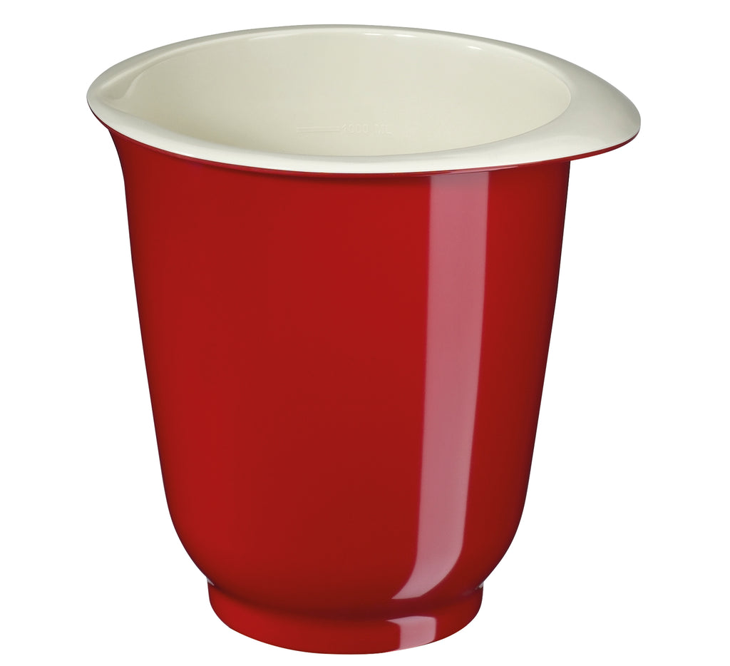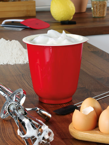 Om in te kloppen, roeren, mengen. De mengbeker heeft 2 maataanduidingen: in ml en in cups, dat kan nog wel eens handig zijn!